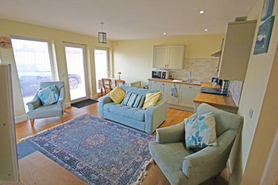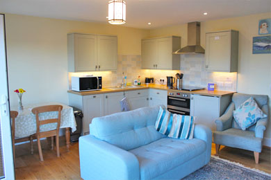 - The sitting/kitchen/dining area is light and airy and furnished with a seaside theme.