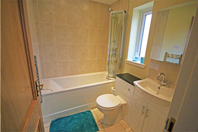 - Family bathroom with a bath with overhead shower and WC, wash hand basin.